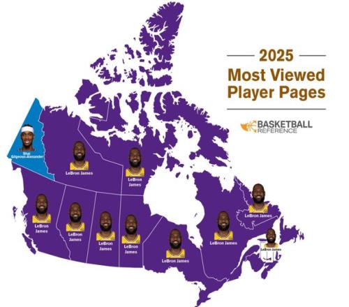 北京时间12月11日,据数据网站BBR显示,其网站今年在各州被浏览次数最多的球员页面分别是:詹姆斯(47个州)、亚历山大(俄克拉荷马州)、约基奇(科罗拉多州)、字母哥(威斯康星州)。加拿大也几乎都被詹姆斯占据。